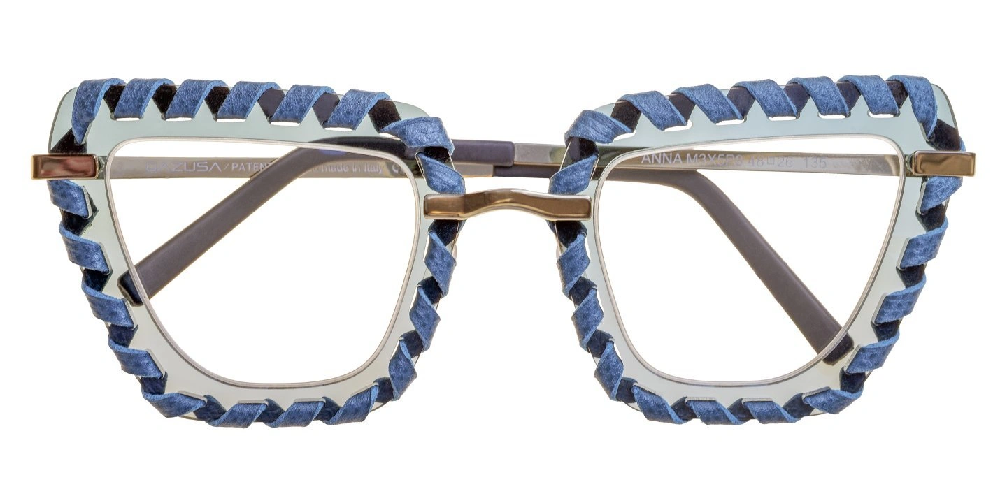 Decidono di forare le lenti, da vista e da sole, e cucirle sul bordo con materiali di alta qualità come pelle, cordino nautico, gomma e filo oro 24kt: in questo modo la protagonista diventa la lente che definisce anche il disegno della montatura stessa.